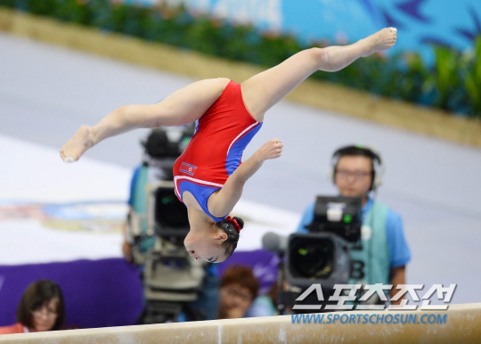 북한체조대표팀 김소영이 25일 인천 남동체육관에서 열린 2014인천아시안게임 여자기계체조 평균대 결승에서 화려한 회전연기를 선보이고 있다.