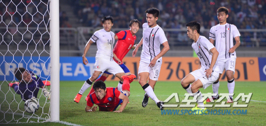 25일 오후 경기도 고양시 고양종합운동장에서 2014 인천 아시안게임 남자 축구 한국과 홍콩의 경기가 열렸다. 한국 임창우의 헤딩슛이 홍콩 얍흥파이 골키퍼의 선방에 막히고 있다.