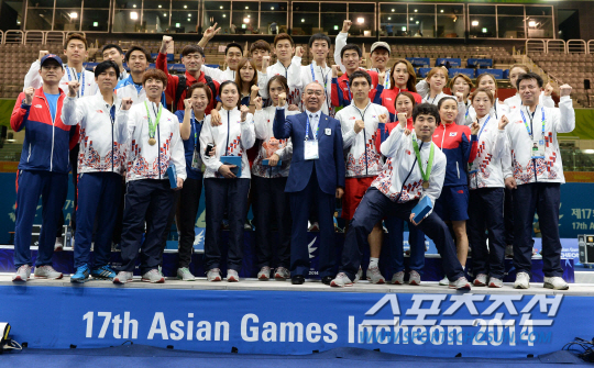 한국 여자 펜싱대표팀(신아람, 최인정, 최은숙, 김명선)이 2014 인천아시안게임 펜싱 여자 에페 단체전 결승에 출전해 은메달을 획득했다. 24일 고양체육관에서 열린 펜싱 여자 에페 단체전 결승경기 후 손길승 대한펜싱협회장과 선수들이 화이팅을 외치고 있다.