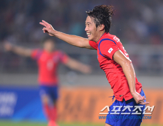 25일 오후 경기도 고양시 고양종합운동장에서 2014 인천 아시안게임 남자 축구 한국과 홍콩의 경기가 열렸다. 선취골을 넣을 한국 이용재가 환호하고 있다.