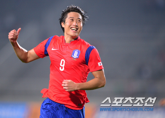 25일 오후 경기도 고양시 고양종합운동장에서 2014 인천 아시안게임 남자 축구 한국과 홍콩의 경기가 열렸다. 선취골을 넣을 한국 이용재가 환호하고 있다.