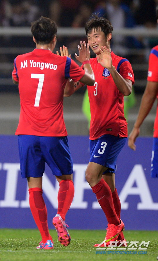 25일 오후 경기도 고양시 고양종합운동장에서 2014 인천 아시안게임 남자 축구 한국과 홍콩의 경기가 열렸다. 후반 한국의 세 번째 골을 성공시킨 김진수가 환호하고 있다.