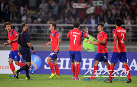 25일 오후 경기도 고양시 고양종합운동장에서 2014 인천 아시안게임 남자 축구 한국과 홍콩의 경기가 열렸다. 후반 한국의 세 번째 골을 성공시킨 김진수(오른쪽에서 두 번째)가 환호하고 있다.