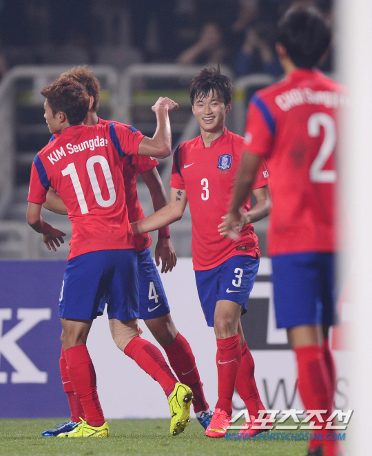 25일 오후 경기도 고양시 고양종합운동장에서 2014 인천 아시안게임 남자 축구 한국과 홍콩의 경기가 열렸다. 후반 한국의 세 번째 골을 성공시킨 김진수가 환호하고 있다.