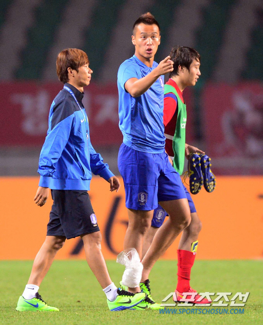 25일 오후 경기도 고양시 고양종합운동장에서 2014 인천 아시안게임 남자 축구 한국과 홍콩의 경기가 열렸다. 3대0으로 승리한 후 한국 김신욱이 그라운드로 걸어 나가고 있다.