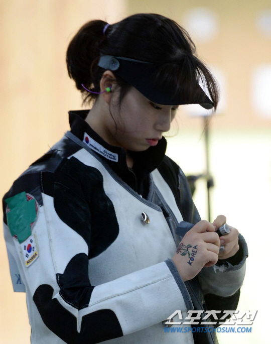 2014 인천 아시안게임 사격 여자 50m 소총.3자세 본선 경기가 26일 인천 옥련국제사격장에서 열렸다. 경기에 출전한 유서영이 장비를 점검하고 있다.
