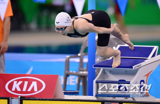 26일 오전 인천 문학박태환수영장에서 2014 인천 아시안게임 수영 여자 개영혼영 200m 예선이 열렸다. 한국 김서영이 힘차게 출발하고 있다.