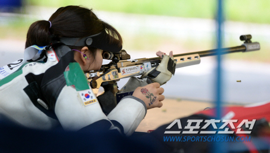 2014 인천 아시안게임 사격 여자 50m 소총.3자세 본선 경기가 26일 인천 옥련국제사격장에서 열렸다. 경기에 출전한 유서영이 방아쇠를 당기고 있다.