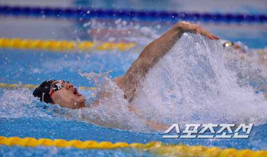 26일 오전 인천 문학박태환수영장에서 2014 인천 아시안게임 남자 혼계영 4X100m 경기가 열렸다. 한국 임태정이 역영하고 있다.