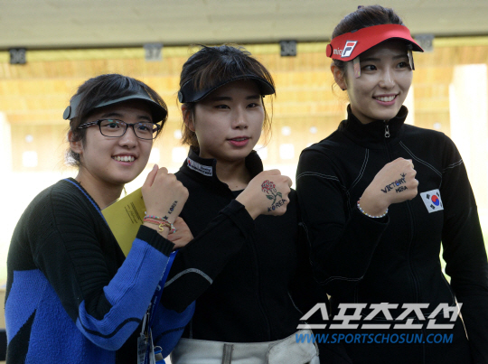 2014 인천 아시안게임 사격 여자 50m 소총 3자세 본선 경기가 26일 인천 옥련국제사격장에서 열렸다. 경기에 출전한 정미라, 유서영, 김설아가 손등에 그려진 응원문구를 보여주고 있다. 세 선수는 단체전 은메달을 따냈고 정미라는 본선 3위를 차지해 개인전 결선에도 진출했다.