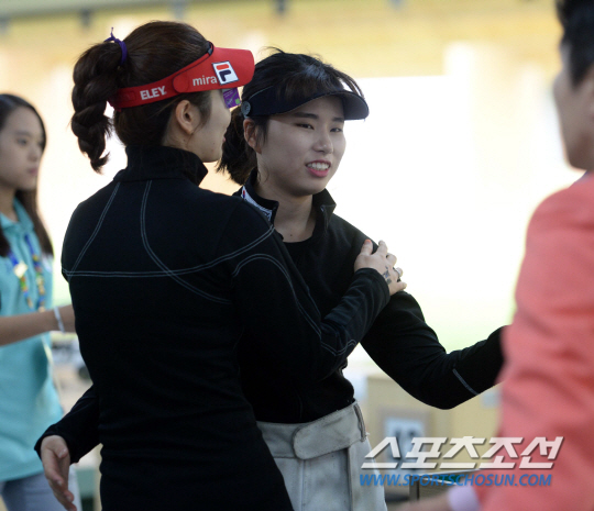 2014 인천 아시안게임 사격 여자 50m 소총 3자세 본선 경기가 26일 인천 옥련국제사격장에서 열렸다. 경기에서 결선에 오른 정미라가 아쉽게 결선진출에 실패한 유서영을 위로하고 있다. 정미라, 유서영, 김설아는 단체전 은메달을 따냈고 정미라는 본선 3위를 차지해 개인전 결선에도 진출했다.