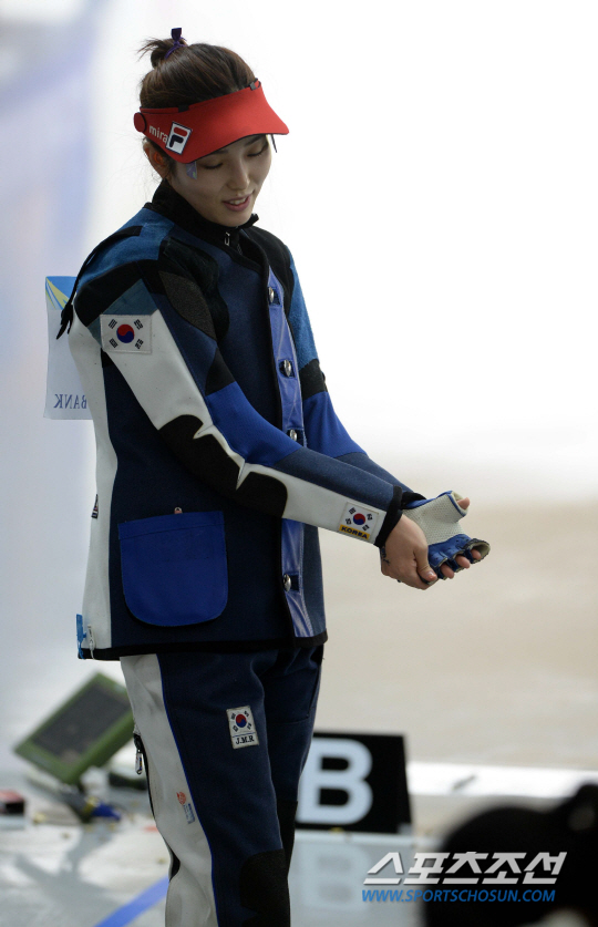 2014 인천 아시안게임 사격 여자 50m 소총 3자세 결선 경기가 26일 인천 옥련국제사격장에서 열렸다. 결선에 진출한 정미라가 1위를 지키고 있던 마지막 한발을 8.4를 쏘며 2위로 경기를 마치고 은메달을 획득하며 아쉬워하고 있다.
