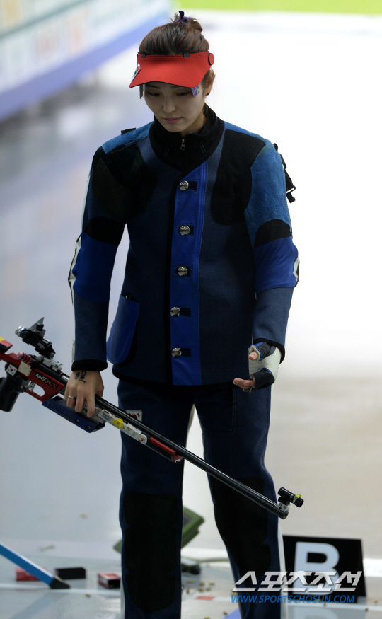 2014 인천 아시안게임 사격 여자 50m 소총 3자세 결선 경기가 26일 인천 옥련국제사격장에서 열렸다. 결선에 진출한 정미라가 1위를 지키고 있던 마지막 한발을 8.4를 쏘며 2위, 은메달로 경기를 마친 후 아쉬워하고 있다.