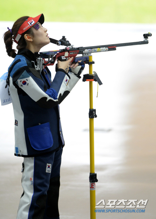 2014 인천 아시안게임 사격 여자 50m 소총 3자세 결선 경기가 26일 인천 옥련국제사격장에서 열렸다. 결선에 진출한 정미라가 경기를 펼치다 잘 풀리지 않는 듯 허공을 바라보고 있다.
