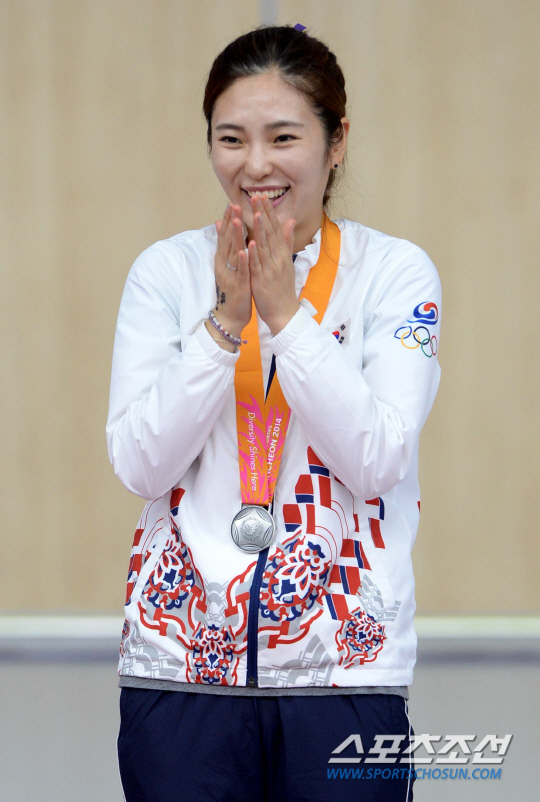 2014 인천 아시안게임 사격 여자 50m 소총 3자세 결선 경기가 26일 인천 옥련국제사격장에서 열렸다. 은메달을 획득한 정미라가 시상대에서 메달과 함께 포즈를 취하고 있다.