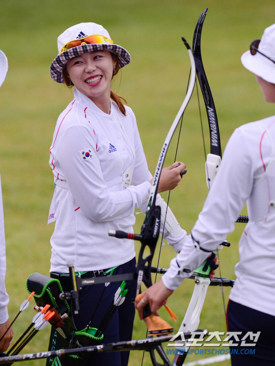 26일 오후 인천 계양아시아드 양궁경기장에서 2014 아시안게임 양궁 여자 리커브 단체전 4강 한국과 인도의 경기가 열렸다. 세트스코어 3대0으로 승리한 한국의 장혜진이 환하게 웃고 있다.