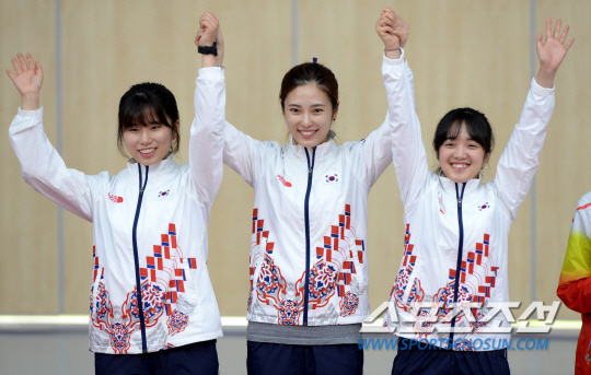 2014 인천 아시안게임 사격 여자 50m 소총 3자세 결선 경기가 26일 인천 옥련국제사격장에서 열렸다. 단체전 은메달을 획득한 유서영, 정미라, 김설아가 시상대에서 메달과 함께 포즈를 취하고 있다.