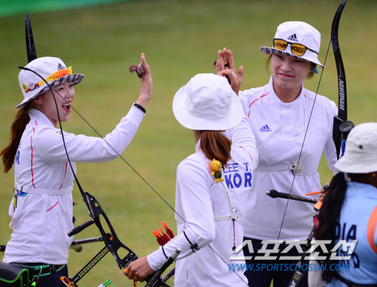 26일 오후 인천 계양아시아드 양궁경기장에서 2014 아시안게임 양궁 여자 리커브 단체전 4강 한국과 인도의 경기가 열렸다. 세트스코어 3대0으로 승리한 한국 선수들이 환하게 웃고 있다.