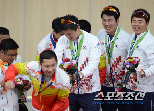 김영민, 장대규, 김진일이 나선 남자 사격대표팀이 26일 인천 옥련사격장에서 열린 2014 인천 아시안게임 사격 남자 25m 센터파이어 권총 단체전서 1739점을 기록하며 동메달을 획득했다. 세 선수가 시상대에서 메달과 함께 포즈를 취하며 금메달을 차지한 중국의 딩펑에 장난을 치고 있다.