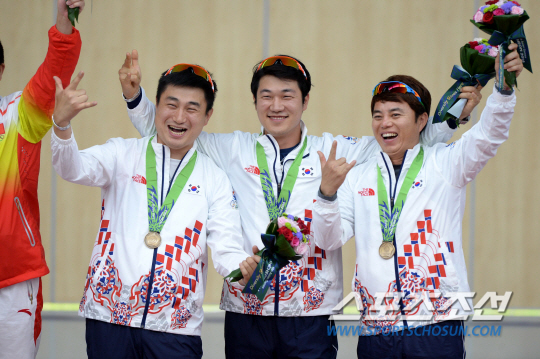 김영민, 장대규, 김진일이 나선 남자 사격대표팀이 26일 인천 옥련사격장에서 열린 2014 인천 아시안게임 사격 남자 25m 센터파이어 권총 단체전서 1739점을 기록하며 동메달을 획득했다. 세 선수가 시상대에서 메달과 함께 포즈를 취하고 있다.