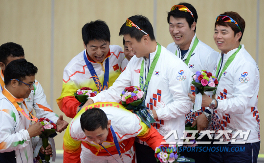 김영민, 장대규, 김진일이 나선 남자 사격대표팀이 26일 인천 옥련사격장에서 열린 2014 인천 아시안게임 사격 남자 25m 센터파이어 권총 단체전서 1739점을 기록하며 동메달을 획득했다. 세 선수가 시상대에서 메달과 함께 포즈를 취하며 금메달을 차지한 중국의 딩펑에 장난을 치고 있다.