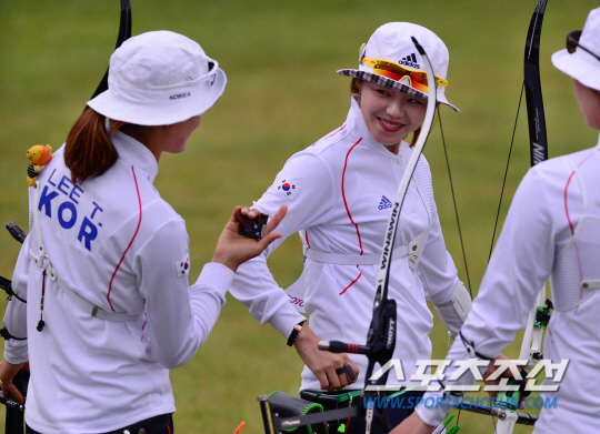 26일 오후 인천 계양아시아드 양궁경기장에서 2014 아시안게임 양궁 여자 리커브 단체전 4강 한국과 인도의 경기가 열렸다. 세트스코어 3대0으로 승리한 한국의 장혜진이 환하게 웃고 있다.