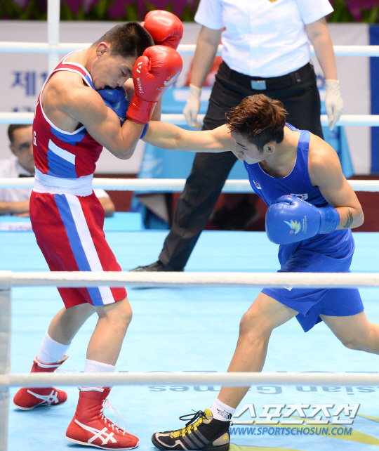 한국복싱대표팀 함상명이 26일 인천선학체육관에서 열린 2014인천아시안게임 남자복싱 56kg급 16강전에서 북한의 권철국을 상대로 펀치를 날리고 있다.