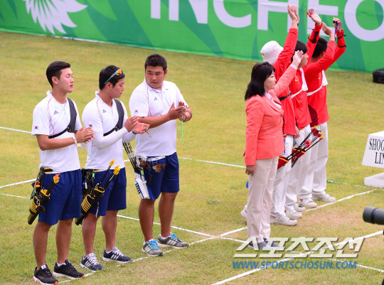 26일 오후 인천 계양아시아드 양궁경기장에서 2014 아시안게임 양궁 남자 리커브 단체전 4강 한국과 중국의 경기가 열렸다. 중국에 패배하며 단체전 결승전 진출이 좌절된 한국 선수들이 아쉬워하고 있다.