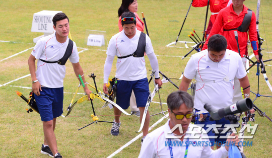 26일 오후 인천 계양아시아드 양궁경기장에서 2014 아시안게임 양궁 남자 리커브 단체전 4강 한국과 중국의 경기가 열렸다. 중국에 패배하며 단체전 결승전 진출이 좌절된 한국 선수들이 아쉬워하고 있다.