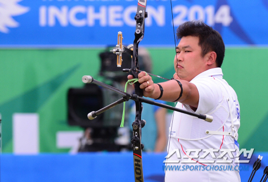 26일 오후 인천 계양아시아드 양궁경기장에서 2014 아시안게임 양궁 남자 리커브 단체전 4강 한국과 인도의 경기가 열렸다. 한국 오진이 과녁을 향해 활시위를 당기고 있다.