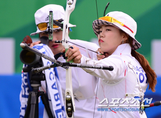 26일 오후 인천 계양아시아드 양궁경기장에서 2014 아시안게임 양궁 여자 리커브 단체전 4강 한국과 인도의 경기가 열렸다. 한국 장혜진이 과녁을 향해 활시위를 당기고 있다.