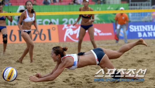 2014 인천 아시안게임 비치발리볼 한국(윤혜숙-이은아)과 중국(왕 판-유에 유안)의 8강전 경기가 26일 인천 송도글로벌캠퍼스 비치발리볼 경기장에서 열렸다. 이은아가 수비를 하기 위해 몸을 날리고 있다.