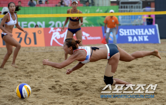2014 인천 아시안게임 비치발리볼 한국(윤혜숙-이은아)과 중국(왕 판-유에 유안)의 8강전 경기가 26일 인천 송도글로벌캠퍼스 비치발리볼 경기장에서 열렸다. 이은아가 수비를 하기 위해 몸을 날리고 있다.