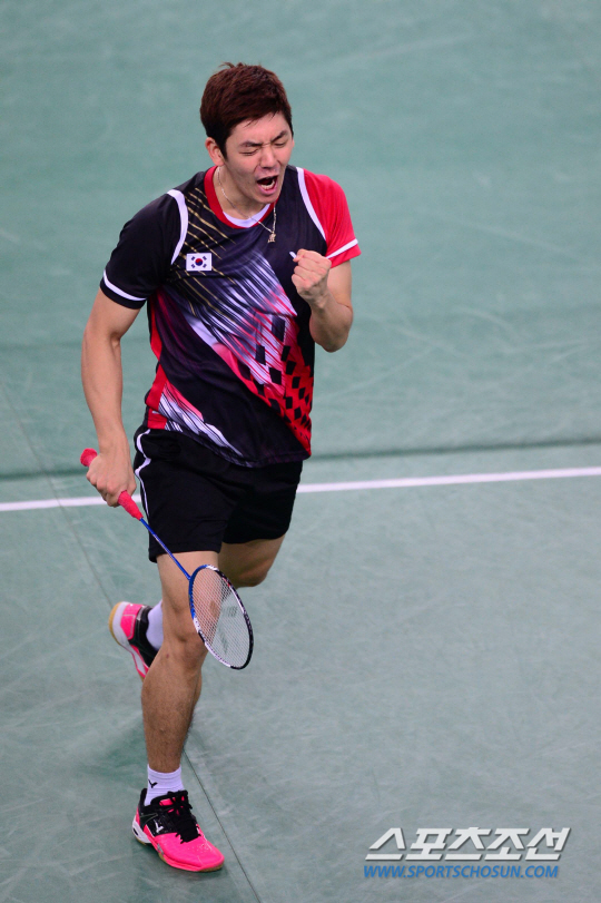 26일 오후 인천 계양체육관에서 2014 인천 아시안게임 배드민턴 남자 복식 8강전 한국과 인도네시아의 경기가 열렸다. 공격에 성공한 한국 이용대가 환호하고 있다.