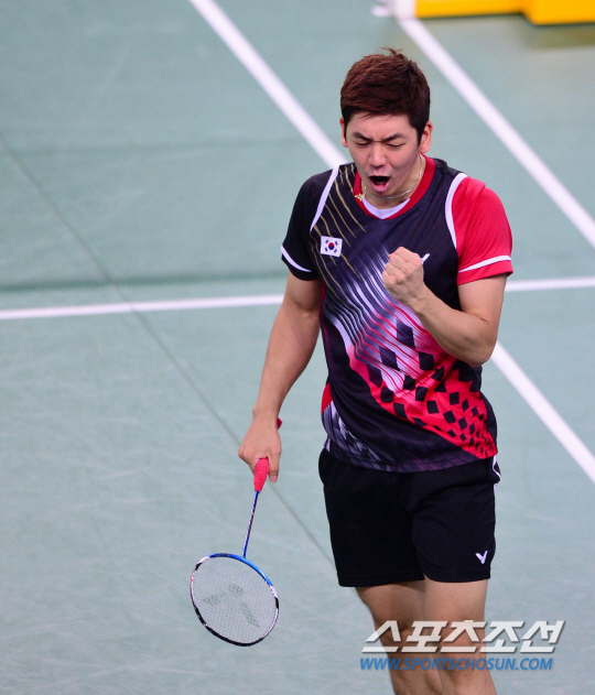 26일 오후 인천 계양체육관에서 2014 인천 아시안게임 배드민턴 남자 복식 8강전 한국과 인도네시아의 경기가 열렸다. 공격에 성공한 한국 이용대가 환호하고 있다.