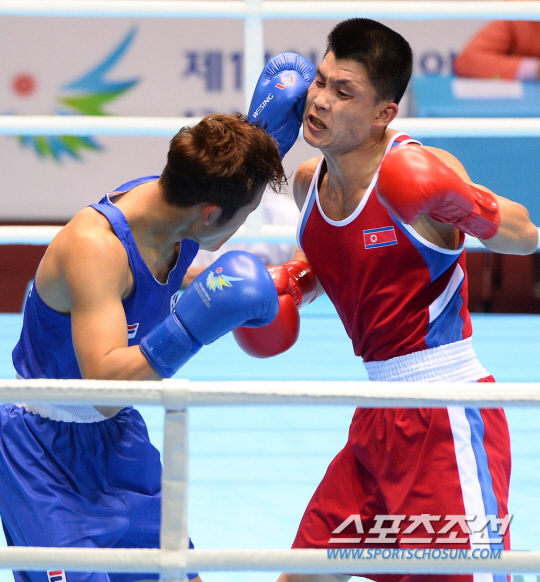 한국복싱대표팀 함상명이 26일 인천선학체육관에서 열린 2014인천아시안게임 남자복싱 56kg급 16강전에서 북한의 권철국을 상대로 펀치를 날리고 있다.