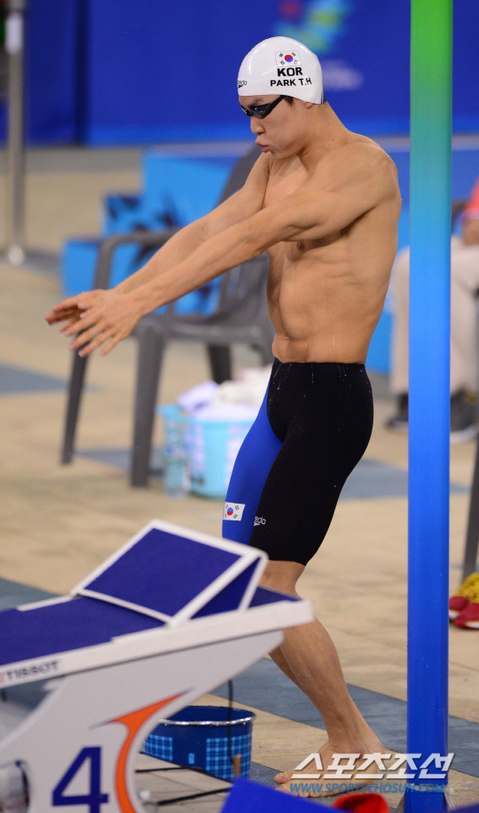 26일 오후 인천 문학박태환수영장에서 2014 아시안게임 남자 자유형 1500m 결승 경기가 열렸다. 경기 전 박태환이 몸에 물을 묻히고 있다.
