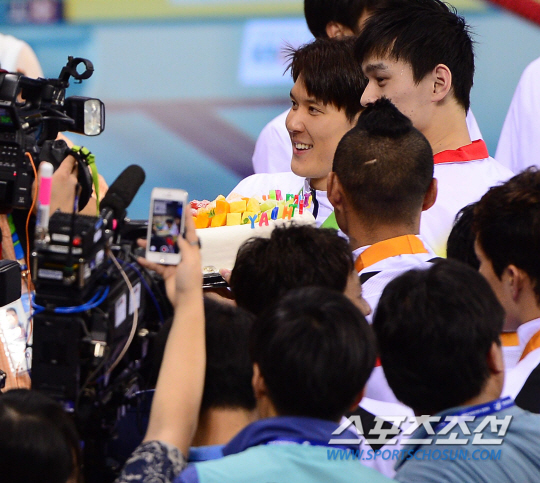 26일 오후 인천 문학박태환수영장에서 2014 아시안게임 남자 자유형 1500m 결승 경기가 열렸다. 경기 후 생일을 맞은 박태환이 중국 쑨양에게 선물을 받고 있다.