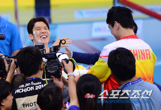 26일 오후 인천 문학박태환수영장에서 2014 아시안게임 남자 자유형 1500m 결승 경기가 열렸다. 경기 후 생일을 맞은 박태환에게 중국 쑨양이 케익을 묻히며 장난치고 있다.