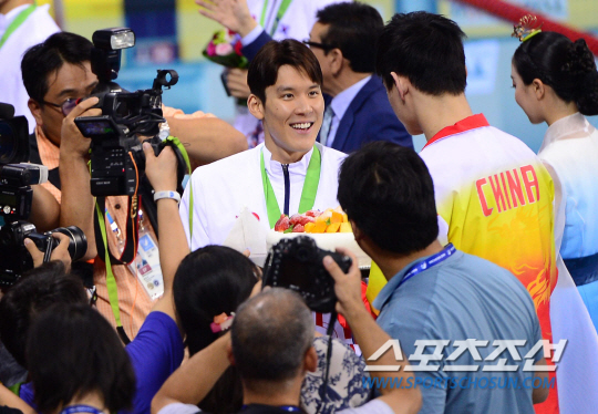 26일 오후 인천 문학박태환수영장에서 2014 아시안게임 남자 자유형 1500m 결승 경기가 열렸다. 경기 후 생일을 맞은 박태환이 중국 쑨양에게 선물을 받고 있다.