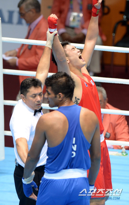2014 인천 아시안게임 복싱 남자 - 91㎏ 헤비급 박남형이 인도의 암리프릿 사이와 16강 경기를 펼쳤다. 26일 인천 선학체육관에서 열린 박남형과 인도의 암리프릿 사이의 경기에서 박남형이 판정승을 거뒀다. 심판의 판정이 내려지자 기뻐하는 박남형의 모습.