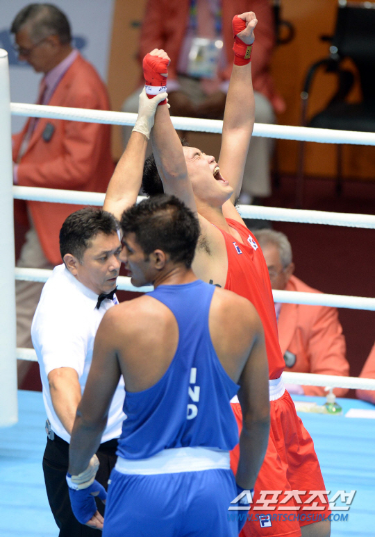2014 인천 아시안게임 복싱 남자 - 91㎏ 헤비급 박남형이 인도의 암리프릿 사이와 16강 경기를 펼쳤다. 26일 인천 선학체육관에서 열린 박남형과 인도의 암리프릿 사이의 경기에서 박남형이 판정승을 거뒀다. 심판의 판정이 내려지자 기뻐하는 박남형의 모습.
