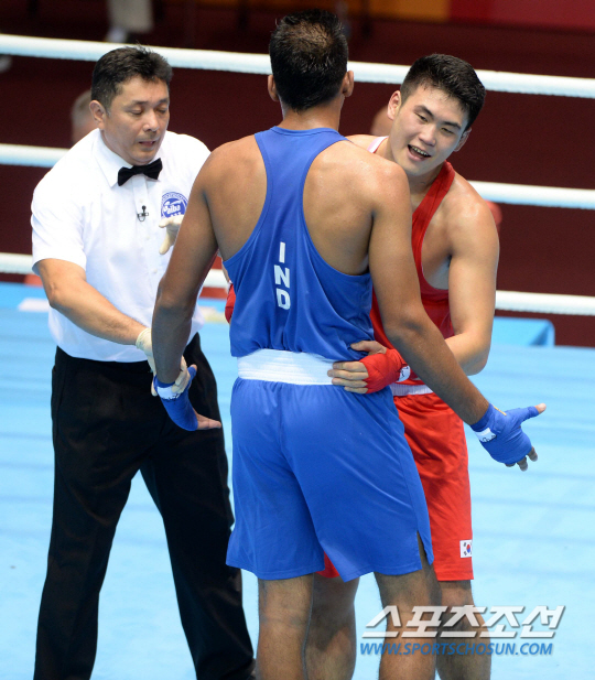 2014 인천 아시안게임 복싱 남자 - 91㎏ 헤비급 박남형이 인도의 암리프릿 사이와 16강 경기를 펼쳤다. 26일 인천 선학체육관에서 열린 박남형과 인도의 암리프릿 사이의 경기에서 박남형이 판정승을 거뒀다. 심판의 판정이 내려지자 기뻐하는 박남형의 모습.