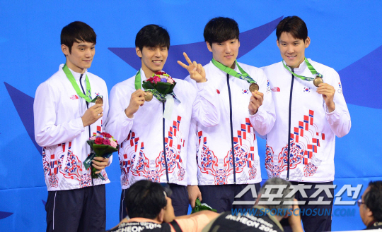 26일 오후 인천 문학박태환수영장에서 2014 아시안게임 남자 자유형 1500m 시상식이 열렸다. 동베달을 딴 박태환 등 한국 선수들이 포즈를 취하고 있다.