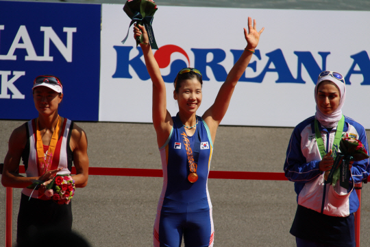 25일 충주탄금호조정경기장에서 벌어진 2014년 인천아시안게임 조정 여자 경량급 싱글스컬에서 금메달을 목에 건 지유진. 사진제공=대한조정협회