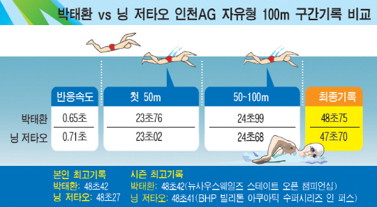 첫 출발부터 50m 구간을 통과할때까지 걱정이 컸다. 출발 반응속도는 0.65로 빨랐지만 초반 50m 기록은 23초76, 4위였다. 금메달 경쟁자인 닝 저타오(중국)가 23초02로 50m를 1위로 통과했다. 200-400m 레이스가 '오버랩'됐다. 50m 지점 턴을 하고 5초가 지나자, 문학박태환수영장에서 환호성이 갑자기 커지기 시작했다. 폭발적인 막판 스퍼트였다. 경쟁자들을 한 명, 두 명 제쳤다. 마지막 10m, 혼신의 역영을 펼쳤다.
