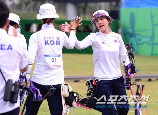 27일 오후 인천 계양아시아드 양궁경기장에서 2014 아시안게임 양궁 컴파운드 여자 단체 결승 한국과 대만의 경기가 열렸다. 10점을 성공시킨 한국 석지현이 동료들과 하이파이브를 나누고 있다.