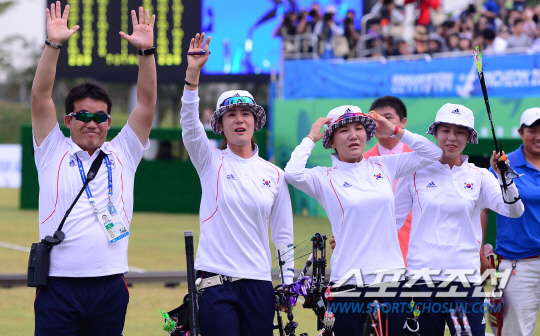 27일 오후 인천 계양아시아드 양궁경기장에서 2014 아시안게임 양궁 컴파운드 여자 단체 결승 한국과 대만의 경기가 열렸다. 금메달을 차지한 한국 선수들이 환화하고 있다.
