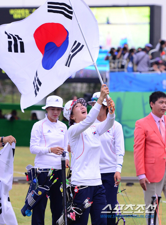 27일 오후 인천 계양아시아드 양궁경기장에서 2014 아시안게임 양궁 컴파운드 여자 단체 결승 한국과 대만의 경기가 열렸다. 금메달을 차지한 한국 선수들이 환호하고 있다.
