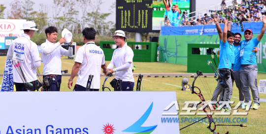 27일 오후 인천 계양아시아드 양궁경기장에서 2014 아시안게임 양궁 컴파운드 남자 단체 결승 한국과 인도의 경기가 열렸다. 은메달을 차지한 한국 선수들이 아쉬워하고 있다.